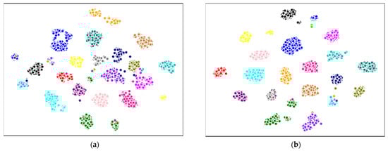 Gait features visualization of the 20 subjects in Dataset #2 (a) features extracted by CNN and (b) features extracted by our proposed CNN+CEDS. The dots of different colors represent the extracted gait features of different subjects.