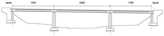 The monitored structure is a prestressed hollow-core concrete bridge constructed in 1964. The design load class is BK 60 (60 tons wheeled type load), according to DIN 1072. With a width of 11.08 m, it has three continuous spans with a total length of 57.00 m (17.00 m–23.00 m–17.00 m) without coupling joints (Figure 1 and Figure 2). The two center columns are designed as individual supports with pot bearing. The superstructure is supported by two linear rocker bearings on the southern abutment, and on the northern abutment, by two roller bearings.