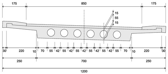- strain in the transverse direction (sensors S55–S79): five strain sensor lines across the cross-section were installed on the underside of the bridge in the area of the maximum bending moments and on the two supports (these sensors have a gauge length of 1.35 m);