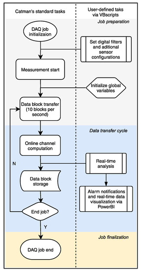 The data acquisition (DAQ) process in Catman (DAQ job) can be divided into three main stages, namely the job preparation, the data transfer cycle, and the job finalization. During each step, a series of closed tasks are executed in the background without the user’s control. The basic workflow of a DAQ job is shown in Figure 5. However, using the Catman’s scripting functionality, it is possible to “intercept” a data block using a scripted procedure to carry out user-defined tasks. The system automatically sets the size of a data block according to the data sampling rate. For a sampling rate of 200 Hz, a data block has 20 measurement points for each of the 184 sensors, giving a total of 10 data transfer cycles per second per sensor (185 cycles every 100 ms). The data block cycle allows the implementation of RTC to process the data as it comes in, which is the core of the novel real-time analysis presented in this work.