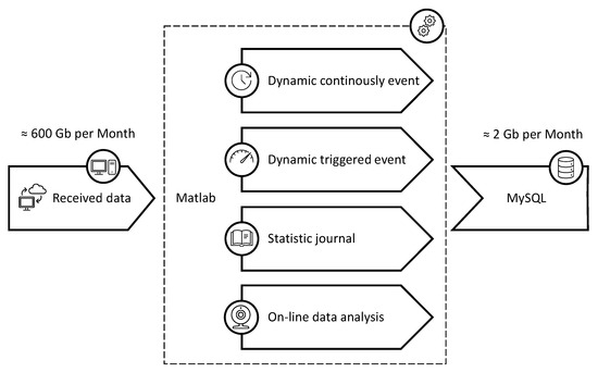 MATLAB is a powerful analysis software known for its vast availability of mathematical and statistical pre-generated methods for data analysis and numerical computation. MATLAB allows the connection with a SQL database and the execution of queries inside the MATLAB workspace among its many attributes. The data on MATLAB can be stored in a SQL database, and an SQL database can be loaded into MATLAB for analysis. The SQL database can save millions of data entries and provides fast access to a specific set of data within the database, optimizing the data saving and the data query for analysis. Figure 6 shows the data storing process, where the received monitoring data is saved into a MySQL database through MATLAB processing. The monitoring system generates about 600 GB of raw data every month. Only 2 GB are effectively stored in the SQL database after executing the pre-processing scripts developed exclusively for this project. Nevertheless, all raw data generated during this SHM project is being stored in an external hard drive disk (HDD) for scientific purposes.