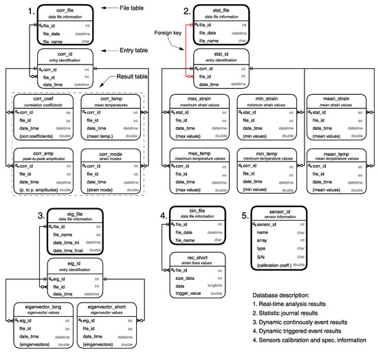 The SQL database was structured to allow easy management and query for post-processing and data visualization. The database schema has four groups of relational tables divided by the type of recorder, as shown in Figure 6, and a single table to store the sensors’ information and calibration coefficients. Additionally, a rainflow analysis result from the dynamic continuously event is saved separately as a MATLAB structure after its pre-processing.