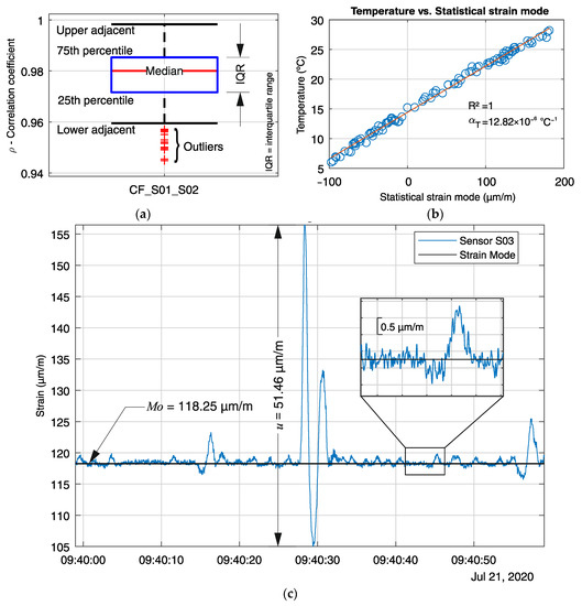 Statistical parameters: (a) Box plot of the correlation coefficient between sensors S01 and S02 measured from 16 July to 6 November 2020; (b) correlation between the strain mode and the temperature from sensor S01 measured from 14 July to 6 November 2020; (c) strain signal from S03 for a one-minute time window, showing the strain mode, and the peak-to-peak amplitude.