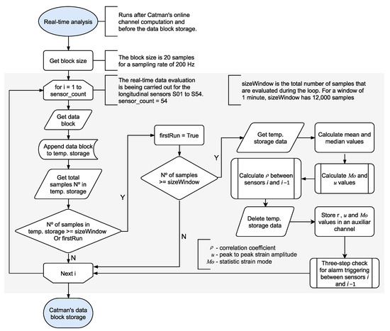 As shown in Figure 5, the real-time analysis intercepts the data block transfer containing each sensor’s last 20 measured samples. Figure 9 shows the flowchart of how the algorithm handles the data block for each sensor i during the real-time analysis. The data block’s samples are collected and appended in a temporary buffer until the size of the temporary buffer reaches the size of the moving time window . When the temporary buffer’s size equals the size of 12,000 samples (equivalent to 60 s), the statistical parameters are extracted from the temporary buffer dataset, as explained at the beginning of this section. Next, the correlation coefficient between sensor i and sensor i − 1 is calculated, as Figure 10 shows. The correlation coefficient is calculated if the peak-to-peak amplitude of either sensor is higher than 30 µm/m, and a low-cut filter removes samples with an absolute value inferior to 5 µm/m. After the calculations, the temporary buffer is erased, and the statistical parameters are sent to auxiliary channels for permanent storage. It is important to note that the algorithm runs during runtime inside the data acquisition software. Therefore, all the tasks take place parallel with the measurements, and before data storage and data transfer.