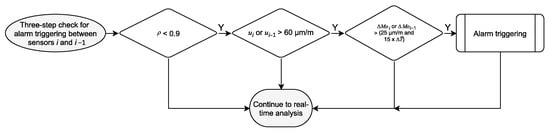 Finally, the three-step alarm trigger checks the calculated parameters for unexpected behavior during the last 60 s dataset, as shown in Figure 11. If all three-steps are triggered, an alarm is immediately sent to the bridge managers. As soon as a time window is thoroughly analyzed, the process repeats itself from the beginning for the next set of 12,000 samples.