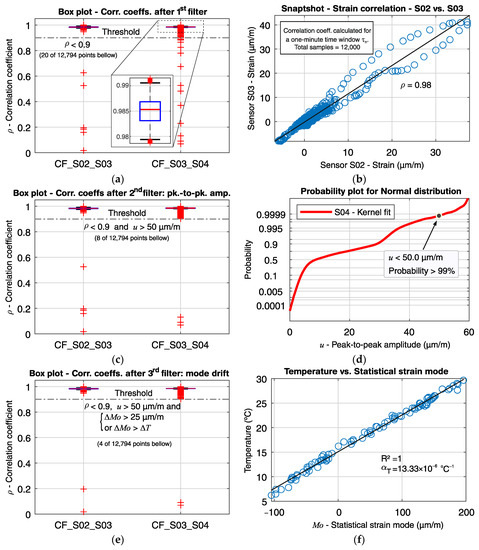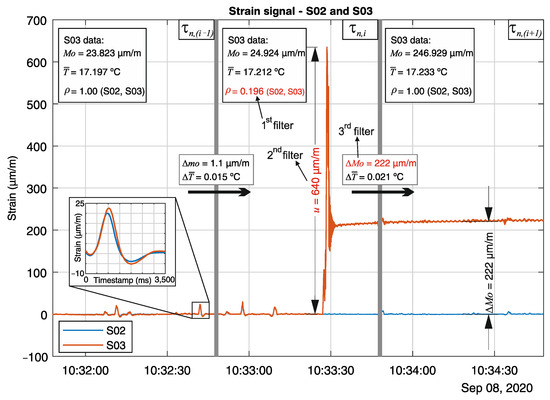 In this section, the detailed results from the novel real-time analysis for the sensors S02, S03, and S04 is first shown, followed by the general study of sensors S01–S27, located in one of the longitudinal quasi-distributed measuring lines. The real-time evaluation algorithm is based on a three-step validation process. Three statistical parameters are continuously calculated parallel to the reception of measurement data for all longitudinal direction sensors (S01 to S54). Each step will be referenced as a filter, as summarized in Table 1. As described in Section 4, the strain correlation coefficient ρ between neighboring sensors, the maximal peak-to-peak amplitude u, and the statistical strain mode Mo are determined for every one-minute time window . Lastly, The PCA results are used to evaluate the correlation between the sensors and their contribution to the structural system’s behavior.