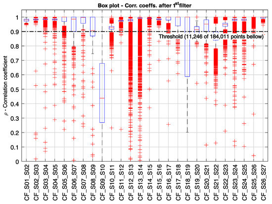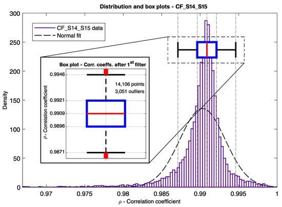 For a continuous monitoring system with high sampling rate measurements on coherent structures with consistent loading, the correlation coefficient between a pair of sensors must remain constant and close to one, if they are well correlated, or close to zero, if there is no correlation. In the case of adjacent sensors disposed along the longitudinal direction of a continuous beam, the correlation coefficient should remain stationary and close to one until a change occurs in the structural system [63]. The evaluation of the correlation between two sensors can also be used to infer already existing geometric discontinuities, e.g., hollow bodies or built-in parts, or pre-existing damages in the structure.