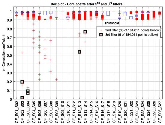 Finally, the same correlation coefficients calculated by the novel real-time analysis algorithm (as explained and demonstrated in Section 4.1 and Section 5.1) can be extracted from the covariance matrix of the data matrix defined in Equation (5). Thus, the correlation coefficient between two neighbouring sensors is given by the element of the covariation matrix of the data matrix , with , where N is the number of sensors (Equation (4)). The correlation coefficient CF_S02_S03 shown in Figure 12a, for example, is equivalent to the covariance element .