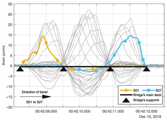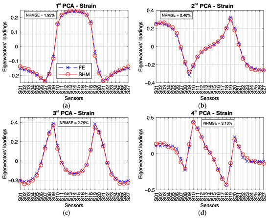 Additionally, the strain signals from sensors S01 to S27 were analyzed using the PCA during a heavy vehicle crossing. The first four principal components were used to evaluate the dependency between the strain sensors’ measurements and highlight the correlation coefficient analysis’s reliability to detect behavior changes.