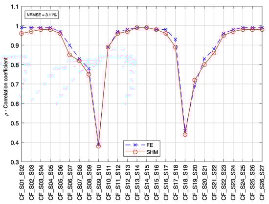Correlation coefficients from sensors S01–S27 during the crossing of the heavy vehicle defined in Figure 17. The values obtained from the SHM data were calculated by the novel real-time analysis algorithm, while the estimated values from the FE model were extracted from the elements of the covariance matrix of the data matrix .