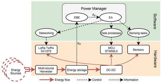In order to validate their design, the energy allocation policies proposed in this paper were implemented on a real multi-source EH-IoT node. The complete block diagram of the proposed node is shown in Figure 1. The hardware part is composed of two boards: a preexisting industrial LoRaWAN platform from Wi6labs and a multi-source energy-harvesting board. Both the networking protocol and power management software module are implemented on a microcontroller. The use of LoRaWAN in this work serves as a context, and no modifications or contributions are made to the LoRaWAN standard stack itself. The full platform is built using off-the-shelf components, making it easier to adopt for industrial applications.