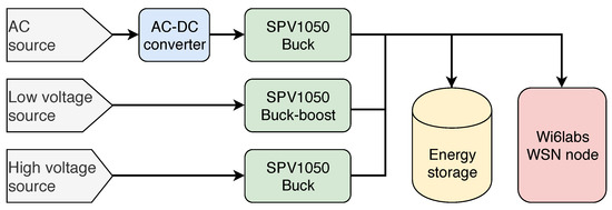 The LoRaWAN platform is powered by a multi-source energy-harvesting board, described in Figure 2, which can combine up to three energy sources: a very low-voltage source, such as a TEG; an alternating voltage source, such as a wind turbine; and a voltage source up to 18 V, such as a solar panel. The board can therefore be used with most of the energy-harvesting sources used for IoT nodes. Moreover, it is possible to change the configuration of each input by changing the value of a few resistors, allowing the adaptation of the board to different applications without designing a new one. In order to ease its potential industrialization, the board is only composed of off-the-shelf components. The architectures allowing the simultaneous harvesting of multiple-energy sources have been previously explored in [5], and the results show that the architecture of Figure 2 gives the best performance. Although the architecture is straightforward, its implementation as well as its integration with energy management techniques in an industrial product are new.