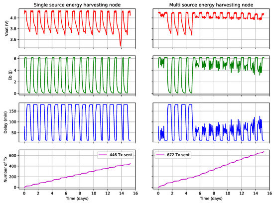 It can be noticed that the type of energy sources used has a direct impact on the efficiency of the multi-source energy-harvesting system. From the second to the fifth days, the first node was powered by two solar panels, providing, respectively, 2 and 3.5 W while the second node was only powered by a 2 W solar panel. During this period, the multi-source energy-harvesting node was only marginally more efficient than the single-source energy-harvesting node, with 141 transmitted packets against 133. Indeed, the 2 W solar panel is sufficient to completely recharge the energy storage and to maximize its QoS at the start of a new day. Thus, the additional solar panel only helps the node recharge its storage faster and additional energy is not required during the day.