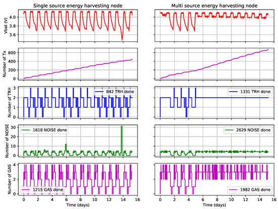 In some time slots, the number of executions of some tasks is higher than the specified maximum. This is due to the fact that each task manages its own timer. In some situations where multiple timers expire at a similar time, a task execution is already scheduled before its new number of executions is calculated. As the scheduler does not check if the task is already in the execution queue, it does not check this task execution, which can lead to an additional task execution. A bug also occurred around days 6 and 14, when the single-source energy-harvesting node, respectively, executed 12 and 31 noise sensing tasks, far more than specified in Table 4. However, these bugs are linked to implementation and do not prevent proper application of the energy-allocation policy.