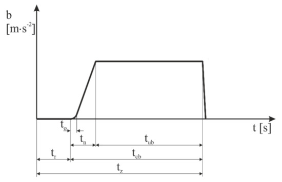 - Braking effect start-up time tn—the time from the moment when the driver starts acting on the braking control until the moment when the pressure achieves 75% of the nominal pressure of the braking system in the most distant brake cylinder of the braking system; thus, the braking effect start-up time also includes the brake response time;