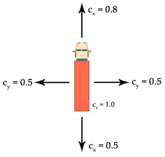 For example, an acceleration coefficient of 0.8 in a given direction means that it is necessary to secure 80% of the weight of the cargo in a given direction. To prevent cargo from moving, the cargo has to be secured in longitudinal and transverse directions according to the worst combination of horizontal and corresponding vertical accelerations. The securing arrangement has to be designed to withstand the forces due to acceleration in each horizontal direction (longitudinal and transverse) separately [75,76]. Illustration of applicable acceleration coefficients for road transport is shown on Figure 2.