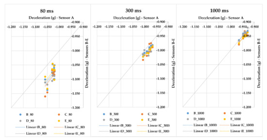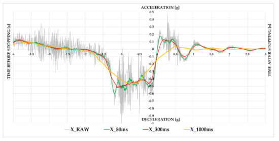 According to the standard prEN 17321:2020 [80], when dynamic acceleration tests are performed, the minimum deceleration dwell time should be 300 ms. The test value is the minimum acceleration recorded during the dwell time. When dynamic driving tests are performed, the minimum acceleration dwell time should be 1000 ms. With a duration of 80 ms, the arithmetic average should meet the required acceleration value. The arithmetic average of the required acceleration is allowed to fall below the required value by 0.05 g in case this value is applied over a period of one second [75,76]. Following this, the resultant raw values were evaluated using the moving average time periods of 80, 300 and 1000 ms. The visible effect of evaluation time on the course of a semi-trailer’s braking can be seen on Figure 3.