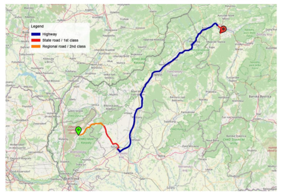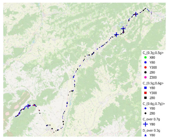 Although, we assumed a high incidence of events exceeding the defined acceleration values, especially in the initial and final sections of the route due to lower road categories, several exceedances were identified during highway transport. These events mainly occurred at bridge edges (crossing through the dilatations). Based on the presented findings, we can state that it is possible to use MEMS devices not only to monitor cargo for its proper securing, but also to support the process of analyzing the condition of the road network based on accelerations caused by crossing selected sections. For these purposes, in future research, it will be possible to carry out further research with different types of vehicles, comparing the results based on the type of vehicle, the type of suspension, and also the velocity of crossing through selected sections of the road network.