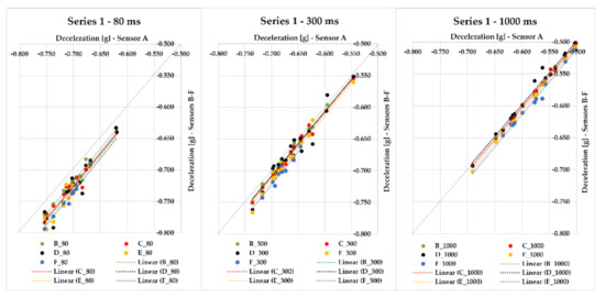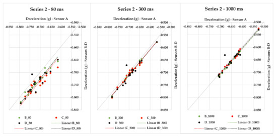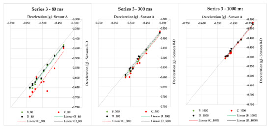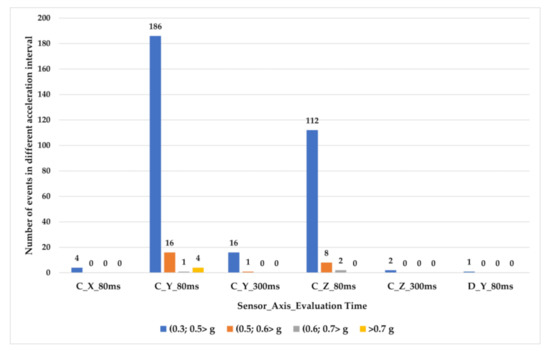 It was necessary to evaluate the raw data measured with sensors prior to their assessment and interpretation. According to the standard EN 12195-1:2010 [75], with superposition of the weight of the load, high-frequency stresses and occasional shock loadings of short duration are absorbed by elongation of the lashing devices and the shock absorber systems of lorries and trailers. This occurs without any significant increase in stress; therefore, this can be ignored for the purpose of this European Standard which gives a practical and not a scientific view [75]. This standard is used for road inspections of cargo securing in the European Union according to the Directive 2014/47/EU of the European Parliament and of the Council of 3 April 2014 on the technical roadside inspection of the roadworthiness of commercial vehicles circulating in the Union [77] as well as for the transport of dangerous goods in subsection 7.5.7.1 of the Agreement Concerning the International Carriage of Dangerous Goods by Road (ADR) [78]. Therefore, the aim of the paper is not to study transport shocks, but minimum/maximum average accelerations in periods of 80, 300, and 1000 ms. Maximum/minimum average acceleration in 80 ms is applied in relation to the EN 12642:2016 [79] standard, which is used in strength tests of superstructures or cargo securing by dynamic driving tests.