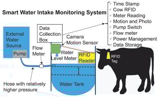 Recently, Radio-Frequency Identification (RFID) technologies [33] have gained popularity in the application of the internet of things [34,35] and especially in sensors and sensing systems [36,37], such as 3D chipless RFID tags [38], fully-textile chipless tags [39], and frequency-signature based wearable tags [40]. The wireless sensor network has also been playing an important role in industrial and agricultural applications [41]. In this work, we propose a portable smart water intake monitoring system for measuring and analyzing the quantity and quality of the water of livestock and wildlife in remote locations. The domestic livestock includes cows and sheep, and the wildlife animals include wild horses and deer. The system is based on multisensor integration in a cost-effective and affordable manner using the complementary method, as shown in Figure 1. The sensors used in the system include RFID readers, motion detectors, water level meters, water flow meters, and temperature sensors. In this system, the RFID reader is applied to identify tags attached to cattle that use the system. The motion detector activates the RFID reader, the camera, as well as the water level meter and water flow meter once an animal, domestic or wild, moves in front of the drinking station. The camera records the front image of the animal. The system records the water amount that the specific animal consumes each time as well as the drinking duration. As wild animals do not have an RFID tag, water consumption by wild animals is recorded using the motion detector and the camera. The water level meter measures water consumption in the drinking station tank. When the level of water in the tank falls below a specific amount, the system opens a valve and refills the tank with water from an external water source, which is recorded by the water flow meter. All the data recorded by the system are stored on an SD card. The system is automated and functions without user input once set up in the field. The sensor network method [41] plays an important role in the proposed system. Compared with other similar systems mentioned in the previous paragraph, the proposed system utilizes sensor networks that combine vision sensors, motion detectors, RFID systems, flow meters, temperature sensors, and turbidity sensors. The complementary data from individual sensors provide a reliable and accurate recording of water quality and water intake of individual animals.