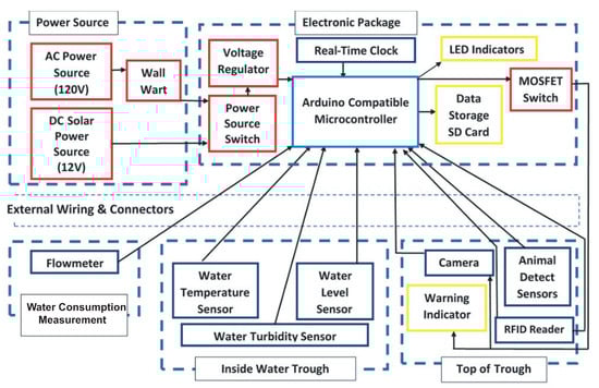 To address the above-mentioned challenges, there is a significant need for an intelligent drinking system that refills the drinking tanks as well as records the quantity and quality of water consumed by each identifiable individual animal. Currently, there are very few solutions addressing water management for monitoring watering behaviors for animal agriculture. Commercial solutions, such as Insetec from Hokomfarm, are usually expensive and mainly utilized by larger framing corporations or research institutions, whereas smaller-sized ranching operations cannot afford to implement these systems for their drinking stations. Another issue is that commercially available solutions are usually confinement setups, which are not easy for remote grazing sites and not able to be used for monitoring wild animals. Based on the design constraints, biological sensing and data acquisition systems [22,23,24,25] would take an important role in developing an integrated water monitoring system by combining low-cost sensors, embedded systems, and data communication or storage devices [26,27,28,29,30,31,32]. Such devices are expected to be deployed in the remote ranching sites to track the water intake and watering behavior of both livestock and wildlife.