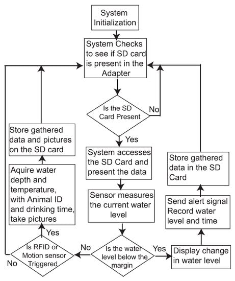 The system software control flow chart is illustrated in Figure 3. After system initiation, the system checks if the connection of the SD card is in a good shape, then it measures the water level to make sure that there is enough water for the animal. If there is not enough water, the system sends an alert and displays the water level on an LCD screen. The water level information is then stored in the SD card. If the system passes the initial checkups, the system searches events from the RFID reader and motion detector, and if there is a drinking event, the system records the data of the event in terms of water depth, temperature, and animal ID. The control program is running on the Arduino Mega board. The current control flow chart uses a polling method to check the RFID and Motion detector every time. The algorithm efficiency could be improved by adapting the interrupt method to let the RFID or Motion Detector to trigger the system data collection.