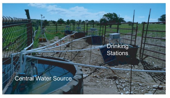 Water is an essential resource in animal agriculture and the number one nutrient required by ruminants [1]. Animal agriculture utilizes 30% of the total water in food production [2]. Given water’s potential impact and a recognized need for improved technologies in rangeland agriculture [3,4], farmers and ranchers continually seek ways to optimize their water management. This need has incentivized the development and utilization of innovations in agriculture. In drought-prone areas such as the southwestern United States, spatial and temporal variation in water availability results in reductions in forage quality and quantity, affects animal productivity, and influences natural resources management decisions. For example, in 2014, livestock producers proactively reduced their herds in response to drought, resulting in New Mexico beef cow inventories dropping by 53,000 cows [5]. In order to remain profitable under variable environmental conditions, livestock producers whose herds are efficient in feed and water use or who adopt water intake efficiency monitoring technologies to inform management decisions will improve fiscal resilience. Therefore, it is important to understand animal water consumption behavior based on both water quality and water access.