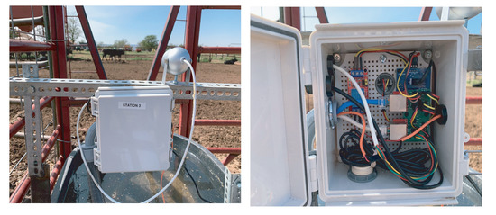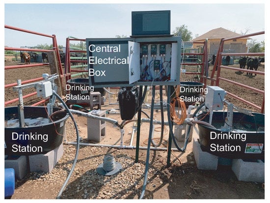 The data collection system deployment in the Tucumcari site is illustrated in Figure 7, Figure 8, Figure 9, Figure 10 and Figure 11. The Tucumcari site is in a more controlled setting, allowing for easier field troubleshooting during the development phase of the system. Figure 7 illustrates one of the systems deployed in the Tucumcari site. The system has one central sensor box which contains four Arduino Boards and four drinking stations that are connected to them. The four Arduino boards act as the central processing unit of each drinking station. It collects and stores data from its different components. Each Arduino board is connected to a junction box containing a converter board. The junction box is connected to the flow meter that tracks the total amount of water. One thermal sensor is deployed at each drinking station to record the water temperature data during the drinking events. Furthermore, each drinking station has an RFID Reader to read the ID of the individual animal’s RFID Tag. A camera is also implemented on each drinking station to take pictures once the motion detector is triggered when an animal is visiting the drinking station.