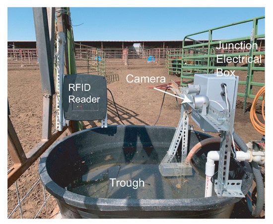 Currently, the system can detect the drinking event including the animal ID, the water consumption, and temperature of the water. The current system does not have the capability to process data from individual sensors to identify sensor failures. For example, the system cannot verify the detected animal ID from the RFID system using the image data. The water turbidity sensor was not enabled and would be added in the later experiments. The system can be further improved by future work from different aspects. For example, the communication system from the remote site could be replaced by satellite communication or dedicated long-range telecommunication. Currently, the data were stored locally in the SD card as the remote site was not covered by the cellular data service. We are trying to deploy data links at the remote site. Once the data link is deployed, we can create a wireless sensor network. At this moment, the remote site has no wireless communication means (cellular or internet). Therefore, the current system does not address the central failure problem. In future work, we plan to add more backup data storage in the system. The animal identification system would benefit from a machine learning-based animal face recognition system in order to alleviate the problem of error detections. Water quality refers to water temperature and water turbidity. More water sensors could be included in the system such as pH sensors specific chemical sensors, for example, sensors to detect Sulfur, Calcium, and Iron, which are the most common problems in New Mexico waters. Weight scales can also be implemented at the drinking station to measure and record the animal’s weight during the drinking event. The improved sensing system may be connected to control systems to perform better water management. For instance, shutting the water supply off if water contamination is detected due to acid rain or other reasons. The system may be combined with weather systems to have an early preparation of weather changes such as heavy rains or high temperatures. Furthermore, the drinking behavior data such as visit time and visit duration of the domestic animal could be applied to train machine learning algorithms to identify the abnormal features of animal health status [47,48,49,50,51]. Early detection and intervention could help save costs related to animal health issues. In summary, more technological advancements are expected to further facilitate water management for animal agriculture. The current system is designed to perform the basic function of water intake monitoring. The presented experimental results are only a demonstration of the system performance. In future work, we also plan to improve the error analysis during system optimization.