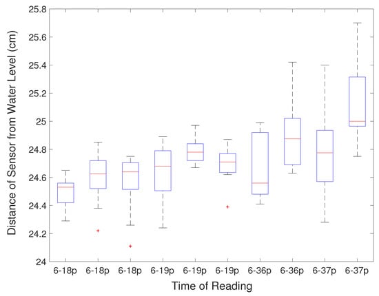The water intake is measured by the water level using the distance sensor. Due to the fluctuation of the water level, each reading of the sensor may not accurately reflect the real water level. Therefore, the system samples the water level multiple times during each drinking event. Statistical methods were used to estimate the actual water level. Figure 12 shows the box plot with errors of the distance sensor readings over time. Only the average water level from multiple sensor readings was recorded in the SD card as the final data, while other readings were discarded in order to save the total data size. The water level estimation is done automatically in the Arduino microcontroller. The plot shows that the average distance of the water level increases, which means the water level is moving away from the fixed sensor due to water consumption. The total sum of the data from the water intake measurement system agrees with the data collected from the flow meter which measures the total water consumption.