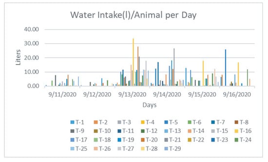The system was deployed in Tucumcari, New Mexico, in the summer of 2020. Two individual systems were placed on both the east side and the west side of the remote station. The system records the drinking events in terms of date, time, water temperature, and initial and final depth of water level. Sensor data and animal behavior data are collected every two weeks. The system senses the animal visit each time at the drinking station and records the water intake. The water intake is then calculated by the difference of the distance sensor readings using the water consumption estimation equation. Animal identifications were captured using both the RFID system and the motion camera system. Water temperature is also recorded. The water turbidity sensor was not enabled and would be added in the later experiments. The main components of the system—animal identification, water intake measurements, and water temperature sensor—are working as expected. The current consumption of the system is 150 mA. Average watering behavior trends and individual animal drinking behavior data were collected and analyzed. The detailed experiment results are presented below.