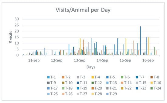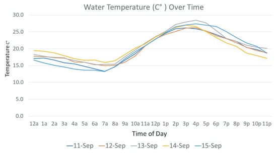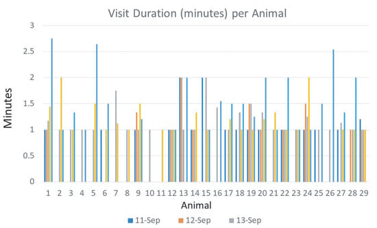 The watering behavior is analyzed by the visit duration per animal and the specific drinking time during the day. It is also related to the water quality such as temperature, pH value, turbidity, and mineral levels of water. The current system detects the drinking duration in the timing resolution of minutes, which could be improved in later systems to the timing resolution of seconds. Furthermore, the currently deployed system only measures the water temperature, which would be extended into pH value and other chemical components of water in future systems. Figure 17 shows how long each animal stayed at the water source. The time was broken into average minutes per day; however, some animals were noted to stand at the water source as long as 10 min without drinking. Water temperature could impact water consumption as well. Figure 18 shows the average water temperature collected by the system. Tracking daily water temperature will not only reflect air temperature changes but could also demonstrate optimum temperature for maximum water intake and watering behavior. Table 1 presents a few lines of raw data stored in the SD card between 8 am and 9 am on August 6 at Station 4 on the East side of the Tucumcari site.
