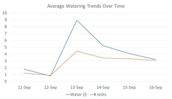 Daily average watering behavior of the drinking station in terms the number of visits and water intake (liters).
