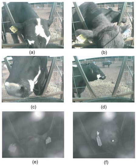 During a drinking event, the motion detector triggers the camera to take pictures. Figure 16 shows example pictures recorded by the camera and stored in the SD card. The pictures are used along with the RFID system to identify the individual cow. Each cow has an RFID tag attached to its ear. The animal ID is also marked on the ear tag. Although the RFID reader can automatically detect the ID, sometimes it misreads it, so it still needs help from the camera systems to identify the animal manually. Figure 16a shows a successful example that the animal ID can be read from the camera. However, sometimes it is difficult to read due to light conditions, as shown in Figure 16b, or because it is blocked, as shown in Figure 16c. The motion camera may make mistakes triggering the camera when there are actually no drinking events. For example, animals walking close to the motion detector may trigger the camera Figure 16d. The camera also works in the evening. Animal IDs can be read from evening pictures Figure 16e, although sometimes it would be blocked as shown in Figure 16f. The size of each picture is small, which is between 12 and 28 kB, so that the SD card can store the raw images for more than two weeks.