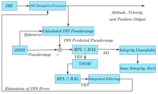 The horizontal alert limit (HAL) and the horizontal protection level (HPL) need to be compared with each other. When some faults in the measurements are not detected and identified, HAL and HPL could give the system protection. HAL is the maximal tolerable value of horizontal position error. When it is exceeded, an alert will be raised. The value of HAL is specified as 40 m in this paper. HPL is an upper bound. If the horizontal position error exceeds HPL, it shall be detected with a 99.9% probability. HPL needs to be computed in real time to check the integrity available and analyze the position-domain to determine whether the estimation could be used for the solution. Two computational passes are required for HPL in this tightly coupled, INS/GNSS-integrated navigation system, the first for checking integrity and the second for checking the availability of the final navigation solutions. A detailed calculation process for HPL is given in Section 3.4.