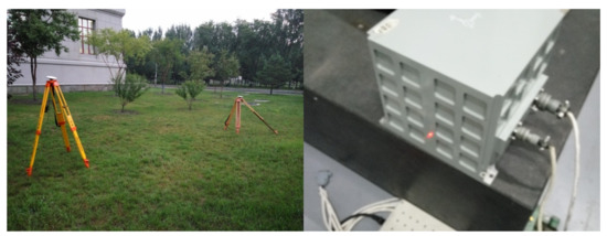The INS was placed on a marble isolation table, and the antenna of the receiver was placed outdoors. The GNSS receiver tracked dual-constellation navigation signals: GPS L1: 1575.42 MHz; BDS B1: 1562.098 MHz. The raw navigation data from the IMU and GNSS receiver were collected for 21,600 s. The arrangement is shown in Figure 3.