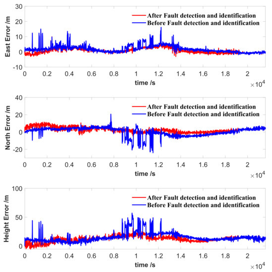The comparison of the position solutions with and without fault detection and identification based on VSOM is shown in Figure 4. The timespan of these data was six hours. There were at least four errors in the range of the 500th second to the 2000th second, obviously before fault detection and identification, and the errors caused an abrupt jump over 5 m. After the detection and identification process, the errors disappeared. The RMSE of the position before fault detection and identification was 5.8459 m, and that after fault detection and identification was 4.4656 m. Considering the position errors before fault detection and identification, this indicates that the proposed method based on the VSOM can detect and identify the faults correctly, and the faulty measurements in the estimation ensure the precision and reliability. The proposed method exhibited superior performance for the detection and identification of faults during static testing.