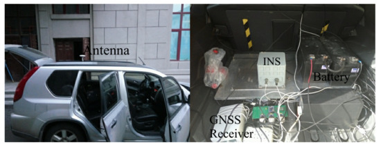 A vehicular dynamic test was performed in an urban environment. The test equipment is shown in Figure 5. The IMU and the receiver antenna were fixed on the vehicle. The GNSS receiver tracked dual-constellation navigation signals: GPS L1: 1575.42 MHz; BDS B1: 1562.098 MHz.