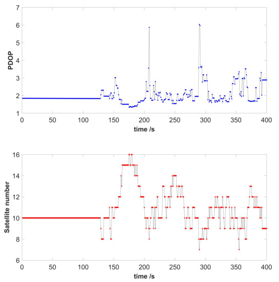 Both GPS and BDS were employed in this experiment, and the number of observed satellites was the sum of that of two systems. Figure 6 shows the positional dilution of precision (PDOP) and the number of satellites visible during the test. The average of the PDOP was 2.02, and the average number of observed satellites was 10.67.