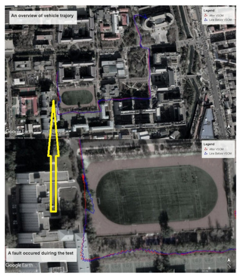 Figure 7 shows an overview of vehicle trajectories, and shows the difference between the trajectories before and after fault detection and identification based on the VSOM. When one or more faults occurred, the trajectory became deformed. As shown in the figure below, a fault occurred at the 350th second, and the fault caused an abrupt disturbance. The proposed method was implemented, and the trajectory was not affected by the fault. Obviously, after down-weighting the fault in the estimation process, the trajectory maintained stability.