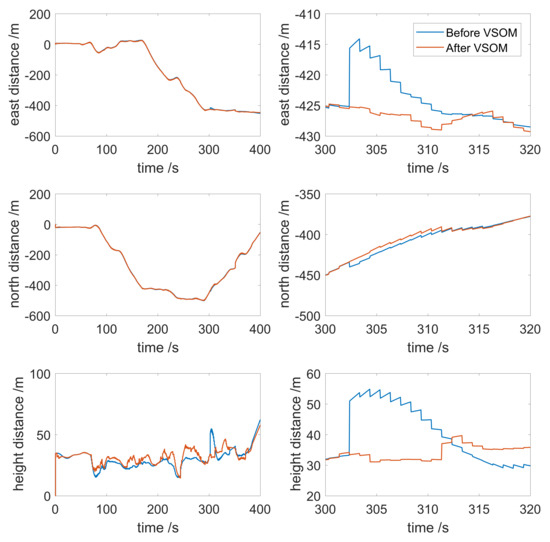 To further reveal the details, the distance from the initial position to the current position over time is shown in Figure 8. As shown in the figure, when the faults occurred, the east/north/upward directions all experienced some disturbance. Before fault detection and identification, the position moved 10 m to the east and 5 m to the south abruptly. A jump in the upward direction of 20 m occurred. After the fault detection and identification, the fault was down-weighted in the estimation process, and the solution was not disturbed. The transitions from the previous position to the fault position, and the fault position to the next position were seamless. This result indicates that the fault detection and identification based on the VSOM could eliminate the vibrations in the estimation caused by the faults. When the weight factors were used for down-weighting approaches to infinity, the corresponding measurements in the estimation were nearly deleted.