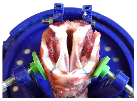 Porcine VFs were used for measurements which were provided by a local slaughterhouse (Mayer, Natters, Austria). The animals have been killed for food purpose and had roughly the same age. A potential risk of tissue degeneration was avoided by keeping the time till measurements as short as possible. They were picked up shortly after death and were prepared for measurements. Thanks to the cooperation and the short transportation chain, it was not necessary to quick freeze the larynges. Therefore, measurements on larynges approximately 4 h postmortem were possible. Four different porcine larynges have been prepared for measurement. To make measurements in the center of the anterior-posterior line of the VFs possible, otiose tissue around the VF was removed and the vestibular folds were pulled to the side by some stitches, as can be seen in Figure 2. One of the four samples could not be used for the measurements because the VFs were damaged during dissection. To protect the samples against dehydration between measurements, the samples are covered by a cloth soaked with NaCl-solution and put in to refrigeration at 4 °C overnight.