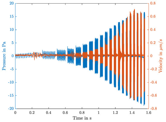 The applied pressure signal (blue) and resulting surface velocity (orange) plotted over time. The pressure signal excites the tissue at each frequency from 50–1000 Hz for 10 periods. The speaker driving voltage is kept constant, due to the speaker’s frequency-dependent sensitivity the pressure level is increasing.