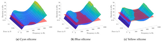In Figure 7, the measurement results are shown. Elasticity values are plotted in the Z-direction against the corresponding frequency on the X-axis and the applied contact force on the Y-axis. Additionally, the transparent red plane symbolizes the static Young’s modulus of each sample. It can clearly be seen that higher contact forces lead to higher elasticity values, due to the increased pretension.