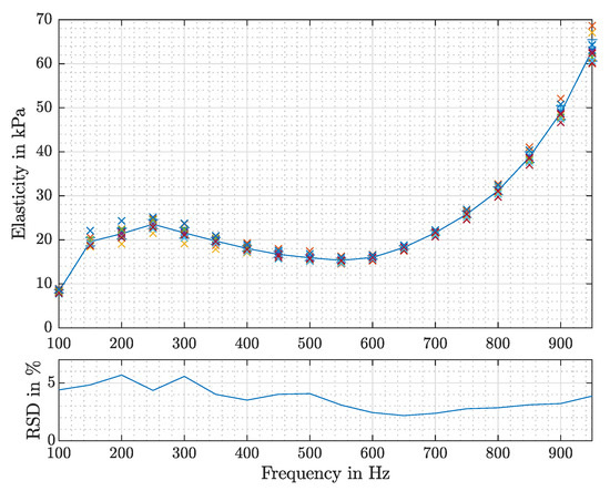 The results are shown in Figure 8, where the frequency-dependent elasticity is illustrated for each measurement. Further the relative standard deviation (RSD) is presented, which reaches a maximum value of 5.68% at 200 Hz.