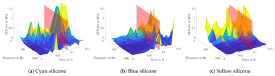 Due to the fact that there is no possibility to verify the measured values with others, only the precision of the measurement, but not the accuracy, can be determined. Therefore, the standard deviation of the Young’s modulus between multiple iterations and excitation pressures is calculated. In Figure 9, the results for all frequencies and contact forces are shown. The red plane symbolizes the contact force of 0.1 N, which was chosen for further examinations. The exact values can be taken from Table 2.