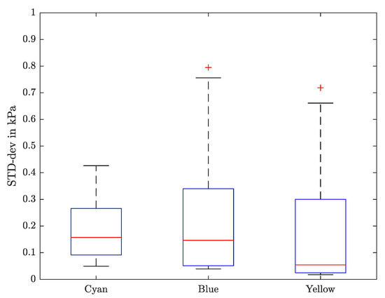 The standard deviation (STD-dev) for each sample with a contact force of about 0.1 N is shown in a box plot, in which the median value is indicated as red line.