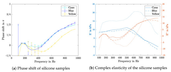 By cross correlating the pressure signal with the sample movement, the phase shift is determined. The results of the silicone samples are shown in Figure 11a, in which a negative phase shift between 200 and 600 Hz can be seen. Further, the phase shift rises up to quarter of a period for high frequencies. The resulting complex elasticities are shown in Figure 11b.