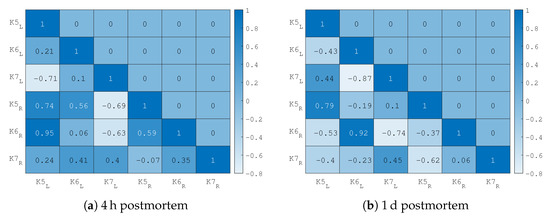 Correlation values between frequency characteristics of different VFs (normalized curves shown in Figure 13). The results for the measurement 4 h are shown in the subfigure (a) and 1 d postmortem in subfigure (b). The saturation of the cell indicates the value of the correlation coefficient.