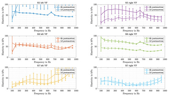 The elasticity values are plotted for each frequency. The measurements were taken 4 h and 1 d postmortem and are shown in subfigure (a) respectively (b). For the left VF on sample K5 the measured values rise up to 180 kPa, for an intuitive comparison the axis is kept the same.